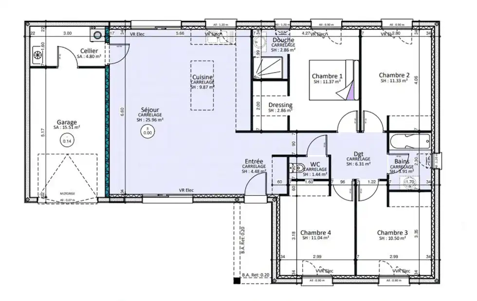 Notre bureau d’études a imaginé cette maison de plain-pied dotée d’un garage intégré, de rangements et d’une suite parentale généreuse qui répondra à votre besoin de tranquillité et d’intimité. Elle comprend un spacieux dressing et une salle de bain attenante, offrant un confort optimal.